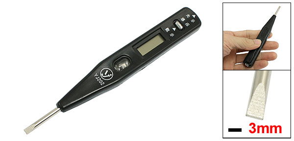 Product Name Electroprobe Material Metal and Plastic Voltage (Max.) AC/DC 500 Color Black Overall Size 12 x 1.5 x 1cm/4.7" x 0.6" x 0.4"(L*W*H) Slotted Screwdiver (Width) 3mm Weight 13g Package Content 1 x Electroprobe - Reviews