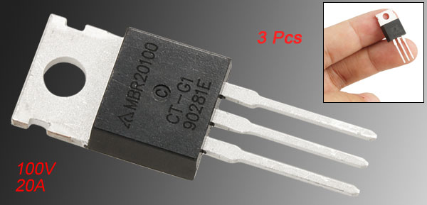 Product Name Schottky Barrier Rectifier Model No. MBR20100CT Drain Source Voltage 100V Drain Current 20A Mounting Hole Diameter 3.7mm/ 0.147" Pin Size 13 x 2.5mm/ 0.51" x 0.11" ( L* Pitch) Total Size 29 x 10 x 4.5mm/ 1.14" x 0.39" x 0.18" (L*W*H) Weight 7.5g Package 3 Pcs x Schottky Barrier Rectifier - Reviews
