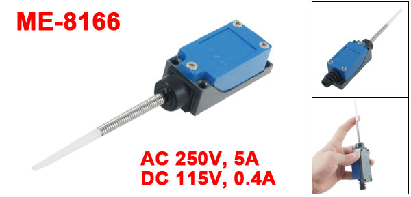 DetailsME-8166 Wobble Spring Stick Rod Actuator Limit Switch for CNC Mill Plasma  Product Name Limit Switch Model No. ME-8166 Actuator Action Momentary Actuator Type Wobble Stick, Automatic Reset Contact Type 1NC + 1NO(SPDT) Rated Voltage & Current AC 250V, 5A DC 115V, 0.4A Coil Spring Size 6 x 45mm / 1.8" x 3.6"(Dia.*L) Stick Total Length 85mm / 3.3" Body Size 88 x 28 x 26mm / 3.5" x 1.1" x 1.0"(L*W*H) Mounting Hole Diameter 4.4mm / 0.17" Mounting Hole Distance 56 x 21mm / 2.2" x 0.83"(L*W) Material Resin, Plastic & Metal Net Weight 62g Package Content 1 x Limit Switch
