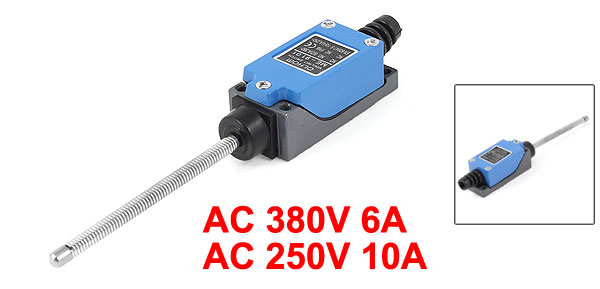 Product Name Limit Switch Model No. ME-9101 Actuator Action Momentary Actuator Type Rotary Lever Contact Configuration 1 NC + 1 NO Rated Voltage AC 380V, 6(2)A; AC 250V, 10(4)A Rotary Lever Length 11.8cm / 4.6" Fixing Hole Diameter 4.3mm / 0.17" Hole Distance(on centers) 56 x 21mm / 2.2" x 0.82" (L * W) Total Size 178 x 28 x 25mm / 7" x 1.1" x 1" (L*W*T) Material Rubber, Plastic & Metal Color Blue, Black Net Weight 63g Package Content 1 x Limit Switch