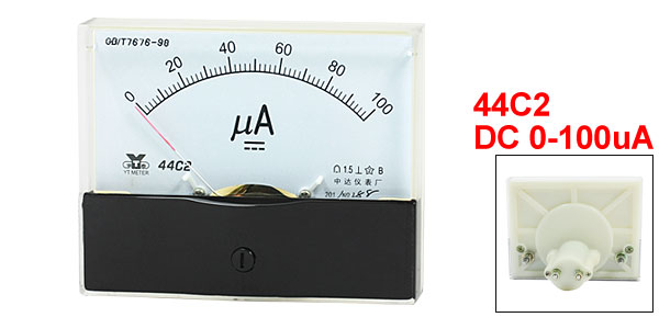 Product Name Analog Ammeter Type 44C2 Measuring Current Range DC 0-100uA Accuracy 1.5 Operating Temperature -20 ~ 40 °C Insulation Force AC 2KV, 50Hz Panel Size(Approx) 100 x 80 x 12mm / 3.9" x 3.1" x 0.47"(L*W*T) Thread Size Big One: 4 x 11mm / 0.16" x 0.43"(D*L)
