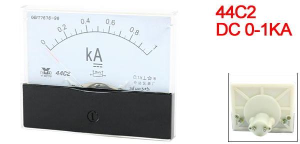 DetailsMeasurement Tool Analog Panel Ammeter Gauge DC 0 - 1KA Measuring Range  Product Name Analog Ammeter Type 44C2 Measuring Current Range DC 0-1KA Accuracy 1.5 Operating Temperature -20 ~ 40 °C Insulation Force AC 2KV, 50Hz Panel Size(Approx) 100 x 80 x 12mm / 3.9" x 3.1" x 0.47"(L*W*T) Thread Size Big One: 4 x 11mm / 0.16" x 0.43"(D*L) Small One: 3 x 7mm / 0.11" x 0.27"(D*L) Overall Depth(Not Included Screw ) 48mm / 1.9" Mounting Size 35 x 25mm / 1.4" x 0.98"(L*W) Color Black, White, Clear Net Weight 113g Package Content 1 x Analog Ammeter Several Installing Parts