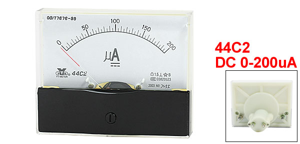 Product Name Analog Ammeter Type 44C2 Measuring Current Range DC 0-200uA Accuracy 1.5 Operating Temperature -20 ~ 40 °C Insulation Force AC 2KV, 50Hz Panel Size(Approx) 100 x 80 x 12mm / 3.9" x 3.1" x 0.47"(L*W*T) Thread Size Big One: 4 x 11mm / 0.16" x 0.43"(D*L)