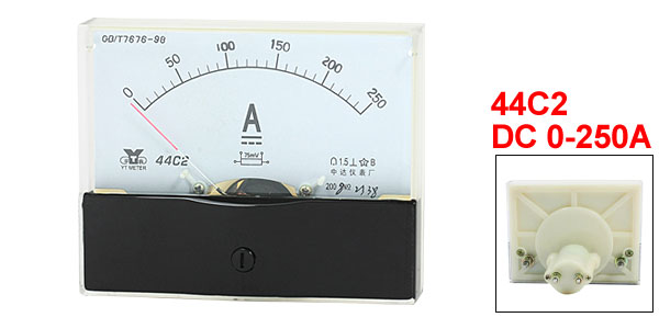 Product Name Analog Ammeter Type 44C2 Measuring Current Range DC 0-250A Accuracy 1.5 Operating Temperature -20 ~ 40 °C Insulation Force AC 2KV, 50Hz Panel Size(Approx) 100 x 80 x 12mm / 3.9" x 3.1" x 0.47"(L*W*T) Thread Size Big One: 4 x 11mm / 0.16" x 0.43"(D*L)