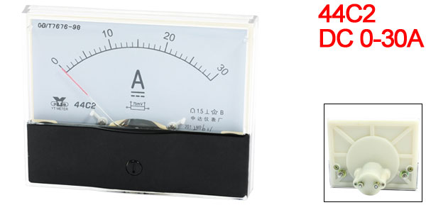 Product Name Analog Ammeter Type 44C2 Measuring Current Range DC 0-30A Accuracy 1.5 Operating Temperature -20 ~ 40 °C Insulation Force AC 2KV, 50Hz Panel Size(Approx) 100 x 80 x 12mm / 3.9" x 3.1" x 0.47"(L*W*T) Thread Size Big One: 4 x 11mm / 0.16" x 0.43"(D*L)