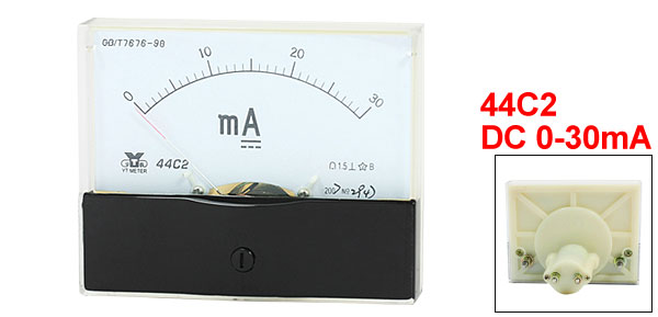 Product Name Analog Ammeter Type 44C2 Measuring Current Range DC 0-30mA Accuracy 1.5 Operating Temperature -20 ~ 40 °C Insulation Force AC 2KV, 50Hz Panel Size(Approx) 100 x 80 x 12mm / 3.9" x 3.1" x 0.47"(L*W*T) Thread Size Big One: 4 x 11mm / 0.16" x 0.43"(D*L)