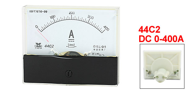 Product Name Analog Ammeterr Type 44C2 Measuring Current Range DC 0-400A Accuracy 1.5 Operating Temperature -20 ~ 40 °C Insulation Force AC 2KV, 50Hz Panel Size(Approx) 100 x 80 x 12mm / 3.9" x 3.1" x 0.47"(L*W*T) Thread Size Big One: 4 x 11mm / 0.16" x 0.43"(D*L)