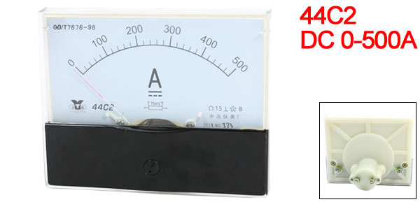 Product Name Analog Ammeter Type 44C2 Measuring Current Range DC 0-500A Accuracy 1.5 Operating Temperature -20 ~ 40 °C Insulation Force AC 2KV, 50Hz Panel Size(Approx) 100 x 80 x 12mm / 3.9" x 3.1" x 0.47"(L*W*T) Thread Size Big One: 4 x 11mm / 0.16" x 0.43"(D*L)