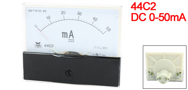 Product Name Analog Ammeter Type 44C2 Measuring Current Range DC 0-50mA Accuracy 1.5 Operating Temperature -20 ~ 40 °C Insulation Force AC 2KV, 50Hz Panel Size(Approx) 100 x 80 x 12mm / 3.9" x 3.1" x 0.47"(L*W*T) Thread Size Big One: 4 x 11mm / 0.16" x 0.43"(D*L)