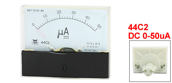 Product Name Analog Ammeter Type 44C2 Measuring Current Range DC 0-50uA Accuracy 1.5 Operating Temperature -20 ~ 40 °C Insulation Force AC 2KV, 50Hz Panel Size(Approx) 100 x 80 x 12mm / 3.9" x 3.1" x 0.47"(L*W*T) Thread Size Big One: 4 x 11mm / 0.16" x 0.43"(D*L)