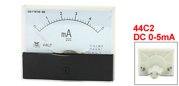 Product Name Analog Ammeter Type 44C2 Measuring Current Range DC 0-5mA Accuracy 1.5 Operating Temperature -20 ~ 40 °C Insulation Force AC 2KV, 50Hz Panel Size(Approx) 100 x 80 x 12mm / 3.9" x 3.1" x 0.47"(L*W*T) Thread Size Big One: 4 x 11mm / 0.16" x 0.43"(D*L)