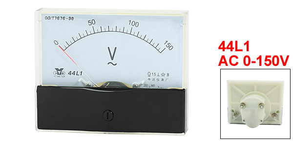 Product Name Analog Voltmeter Type 44L1 Measuring Current Range AC 0-150V Accuracy 1.5 Operating Temperature -20 ~ 40 °C Insulation Force AC 2KV, 50Hz Panel Size(Approx) 100 x 80 x 12mm / 3.9" x 3.1" x 0.47"(L*W*T) Thread Size Long One: 4 x 11mm / 0.16" x 0.43"(D*L)