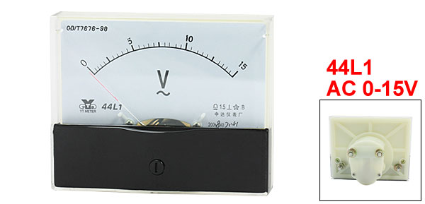 Product Name Analog Voltmeter Type 44L1 Measuring Current Range AC 0-15V Accuracy 1.5 Operating Temperature -20 ~ 40 °C Insulation Force AC 2KV, 50Hz Panel Size(Approx) 100 x 80 x 12mm / 3.9" x 3.1" x 0.47"(L*W*T) Thread Size Long One: 4 x 11mm / 0.16" x 0.43"(D*L)