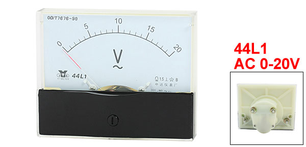 Product Name Analog Voltmeter Type 44L1 Measuring Current Range AC 0-20V Accuracy 1.5 Operating Temperature -20 ~ 40 °C Insulation Force AC 2KV, 50Hz Panel Size(Approx) 100 x 80 x 12mm / 3.9" x 3.1" x 0.47"(L*W*T) Thread Size Long One: 4 x 11mm / 0.16" x 0.43"(D*L)