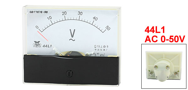 Product Name Analog Voltmeter Type 44L1 Measuring Current Range AC 0-50V Accuracy 1.5 Operating Temperature -20 ~ 40 °C Insulation Force AC 2KV, 50Hz Panel Size(Approx) 100 x 80 x 12mm / 3.9" x 3.1" x 0.47"(L*W*T) Thread Size Long One: 4 x 11mm / 0.16" x 0.43"(D*L)
