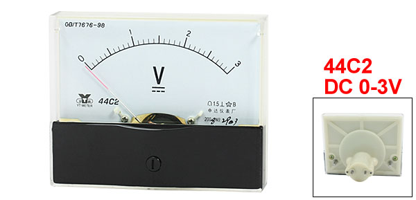 Product Name Analog Voltmeter Type 44C2 Measuring Current Range DC 0-3V Accuracy 1.5 Operating Temperature -20 ~ 40 °C Insulation Force AC 2KV, 50Hz Panel Size(Approx) 100 x 80 x 12mm / 3.9" x 3.1" x 0.47"(L*W*T) Thread Size Long One: 4 x 11mm / 0.16" x 0.43"(D*L)