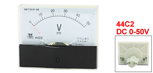 Product Name Analog Voltmeter Type 44C2 Measuring Current Range DC 0-50V Accuracy 1.5 Operating Temperature -20 ~ 40 °C Insulation Force AC 2KV, 50Hz Panel Size(Approx) 100 x 80 x 12mm / 3.9" x 3.1" x 0.47"(L*W*T) Thread Size Long One: 4 x 11mm / 0.16" x 0.43"(D*L)