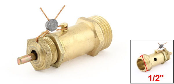 DetailsMetal 1/2"PT Thread Safety Pressure Relief Valve Gold Tone for Air Compressor  Product Name Pressure Relief Valve Material Metal Color Gold Tone Thread Diameter 21mm/1/2"PT Valve Total Size 6.1 x 2.1cm/ 2.4" x 0.83"(L*W) Weight 57g Package Content 1 x Pressure Relief Valve