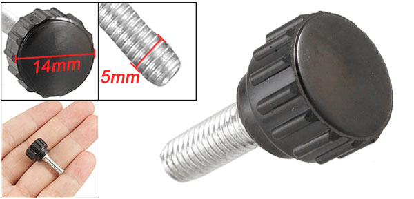 Product Name Knurled Knob Type Screw On Head Diameter(Approx) 14mm / 0.551" Thread Pole Length(Approx) 15mm / 0.590" Thread Pole Diameter(Approx) 5mm / 0.197" Overall Height 26mm / 1.023" Material Metal & Plastic Color Silver Tone & Black Weight 5g Package Content 1 x Knurled Knob - Reviews