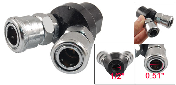 Product Name Quick Coupler Material Metal, Aluminum Color Silver Tone, Black Air Outlet 2 Way Connector Diameter 13mm/0.51'' Thread Diameter 12.5mm/1/2'' Overall Size(Approx.) 68 x 37 x 65mm/2.7'' x 1.5'' x 2.6'' (L*W*H) Weight 174g Package Content 1 x 2 Way Quick Coupler - Reviews