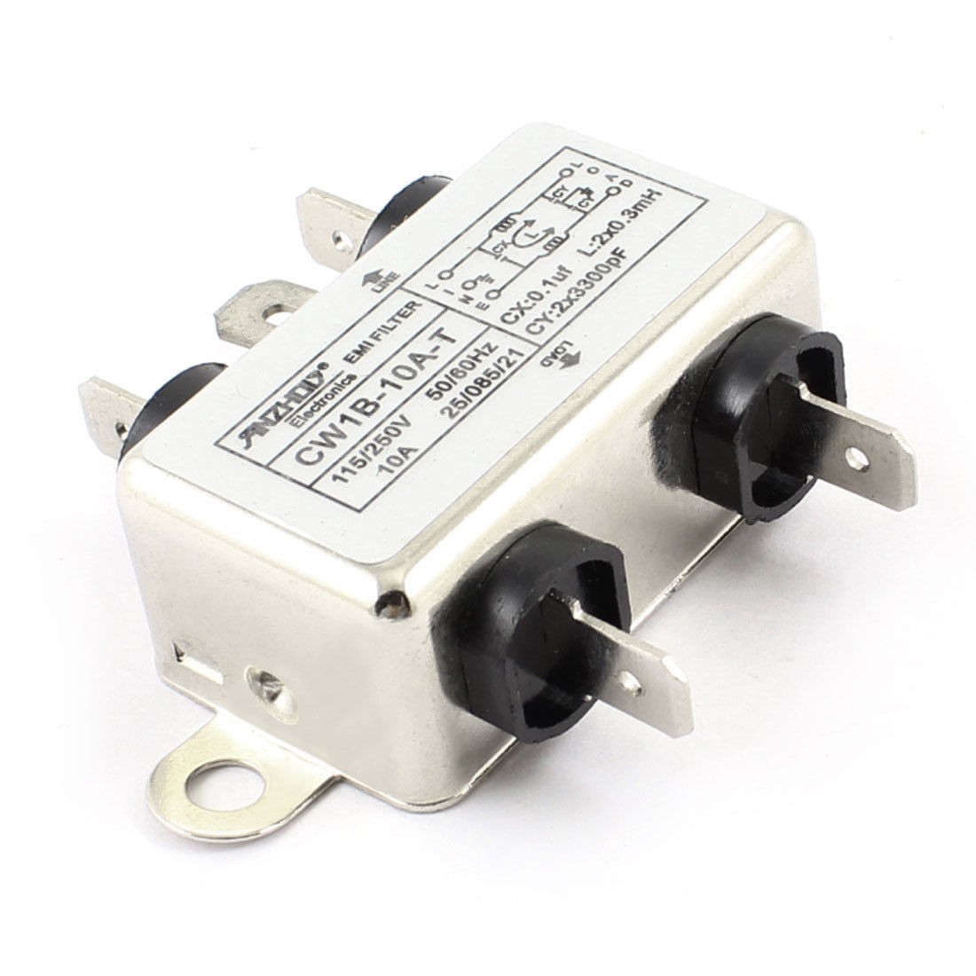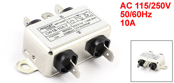 Product Name EMI Filter Model No. CW1B-10A-T Rated Current 10A Rated Voltage AC 115/250V, 50/60Hz Mounting Hole Diameter 5mm / 0.2" Overall Size(Approx.) 64 x 52 x 19mm / 2.5" x 2" x 0.7"(L*W*T) Shell Material Metal Net Weight 41g Package Content 1 x EMI Filter - Reviews