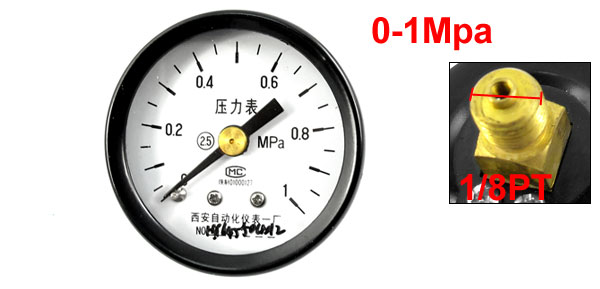 Product Name Pressure Gauge Model Y40Z Scale Range 0-1Mpa Accuracy Grade Class 2.5 Total Size 4.3 x 4.2 x 2.4cm / 17" x 1.65" x 0.94" (L*D*T) Dial Dia 3.6cm/1.4" Thread Diameter 9.5mm/ 1/8PT External Material Metal, Brass Color Black, White Net Weight 60g Package Content 1 x Pressure Gauge - Reviews