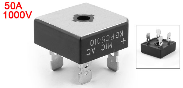 Product Name Bridge Rectifier Model KBPC5010 Average Forward Rectified Current 50A Recurrent Peak Reverse Voltage 1000V Max. DC Blocking Voltage 1000V Terminal Size 12 x 6mm/ 4.7" x 2.4"(L*W) Dimension 27 x 27 x 11mm/ 1.06" x 1.06" x 0.43" (L*W*T) Mounted Hole Dia. 5mm/ 0.2" Center Hole Dia. 2.1mm/0.08" Material Resin, Metal Color Black, Silver Tone Net Weight 21g Package Content 1 x Bridge Rectifier - Reviews
