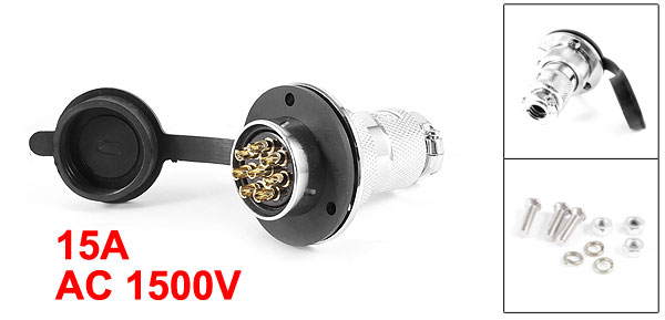Product Name Aviation Connector Plug Model GX25-8 Rated Current 15A Withstand Voltage AC 1000V Insulation Resistence >1000 mOhm Contact Resistance < 5 mOhm Contact Head Diameter 25mm / 1" Pin Quantity 8 Pin Flange Diameter 40mm / 1.6" Flange Mounting hole Dia 5mm / 0.12" Total Length 60mm/ 2.4" Material Metal,Plastic Color Silver Tone, Black Weight 106g Package 1 x Aviation Connector Plug