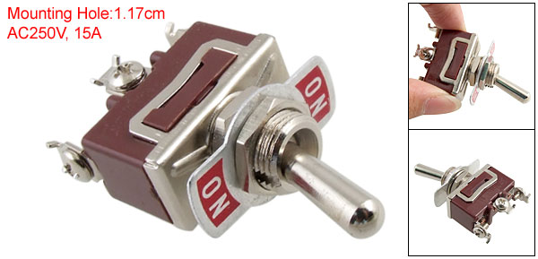 Product Name Toggle Switch Material Metal & Plastic Type SPDT (ON/ON), Latching Power AC 250V 15A Position 2 Mounting Hole ~1.17cm / 0.46" Size ~3 x 1.5 x 5.5cm / 1.2 x 0.59 x 2.2"(L*W*H) Color Red & Silver Tone Weight 29g Package Content 1 x ON/ON Toggle Switch - Reviews