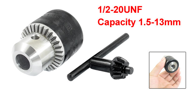 Product Name Drill Chuck Capacity 1.5-13mm / 0.05" - 0.51" Mount 1/2-20UNF Drill Chuck Outer Diameter 42mm / 1.65" Drill Chuck Total Length 59mm / 2.3" Key Size 80 x 42mm/ 3.1" x 1.65"(L * W) Color Black, Silver Tone Main Material Metal Weight 303g Package Content 1 x Drill Chuck