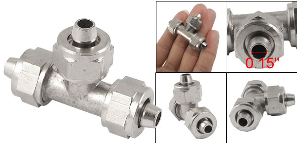 Product Name Tee Fitting Material Metal Color Silver Tone Port Diameter 4 x 6mm/0.15" x 0.23"(ID*OD) Overall Size 45 x 30 x 15mm/1.7" x 1.18" x 0.6"(L*W*T) Weight 43g Package Content 1 x Tee Air Fitting - Reviews