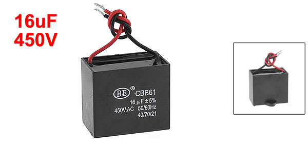 Product Name Motor Capacitor Model CBB61 Color Black External Material Plastic Dielectric Material Metalized Polypropylene Film Rated Capacitance 16uF Tolerance ±5% Rated Frequency 50/60Hz Rated Voltage AC 450V Body Size 50 x 43 x 40mm/ 2" x 1.6" x 1.57"(H*W*T) Fixing Hole Diameter 4.8mm/0.19" Cable Length 10cm / 3.9" Net Weight 75g Package Content 1 x Motor Run Capacitor - Reviews