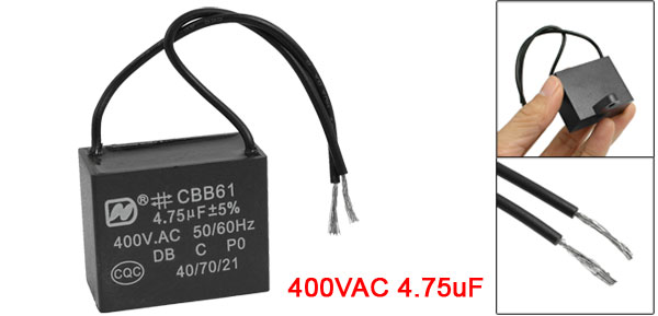 Terminal Wire Ambient Temperature 40/70/21 Rated Capacitance 4.75uF Tolerance +/-5% Rated Frequency 50/60Hz Rated Voltage 400V AC Size 3.8 x 3.1 x 2cm / 1.5" x 1.2" x 0.8" (L*W*T) Wire Length 10cm / 3.9" Install Bore Diameter 0.5cm/ 0.2" Main Color Black Weight 37g Package Content 1 x Motor Capacitor - Reviews