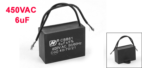 DetailsMetallized Polypropylene Black Wires Motor Fan Capacitor 450VAC 6uF CBB61  Product Name Motor Capacitor Model CBB61 Dielectric Material Metallized Polypropylene Terminal Wire Ambient Temperature 40/70/21 Rated Capacitance 6uF Tolerance +/-5% Rated Frequency 50/60Hz Rated Voltage 450V AC Size 4.8 x 3.5x 2.1cm / 1.88" x 1.37" x 0.83" (L*W*T) Wire Length 10cm / 3.9 Install Bore Diameter 4.5cm/ 0.17" Main Color Black Weight 40g Package Content 1 x Motor Capacitor