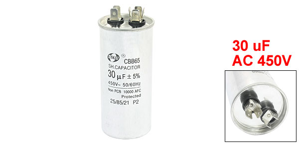 Product Name Motor Capacitor Model No. CBB65 Dielectric Material Metallized Polypropylene Film Housing Material Metal Capacitance 30 uF Tolerance 5% Rated Voltage 450V AC Frequency 50/60Hz Operating Temperature 25/85/21 Size 10 x 4.5cm / 3.9" x 1.8" (H*D) Color Silver Tone Weight 170g Package Content 1 x Motor Capacitor - Reviews