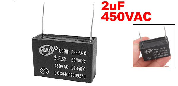 Product Name Motor Capacitor Housing Material Plastic Dielectric Material Metallized Polypropylene Film Model CBB61 Capacitance 2uF Tolerance ±5% Rated Voltage 450VAC Frequency 50/60Hz Temperature -25~70 Celsius Degree Body Size 2.5 x 3.9 x 1.6cm/0.98" x 1.5" x 0.6"(H * W * T) Lead Diameter 0.9mm/0.035" Color As Picture Shown Weight 19g Package Content 1 x Motor Capacitor - Reviews