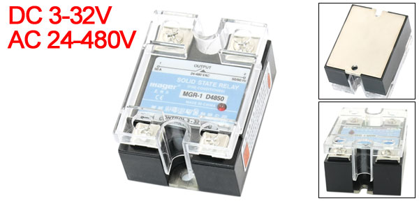 Product Name Solid State Relay Type MGR-1 D4850 Input DC 3-32V Output AC 24-480V 50A 50/60Hz Phase 1 Screw Terminal 4 Fixing Hole Dia 4.5mm/0.14" Fixing Center Distance 50mm/2" Total Size (Approx.) 59 x 49x 32mm/ 2.4" x 2" x 1.3"(L*W*T) Material Plastic, Electric Part Net Weight 88g Total Weight 93g Package Content 1 x Solid State Relay w Clear Cover