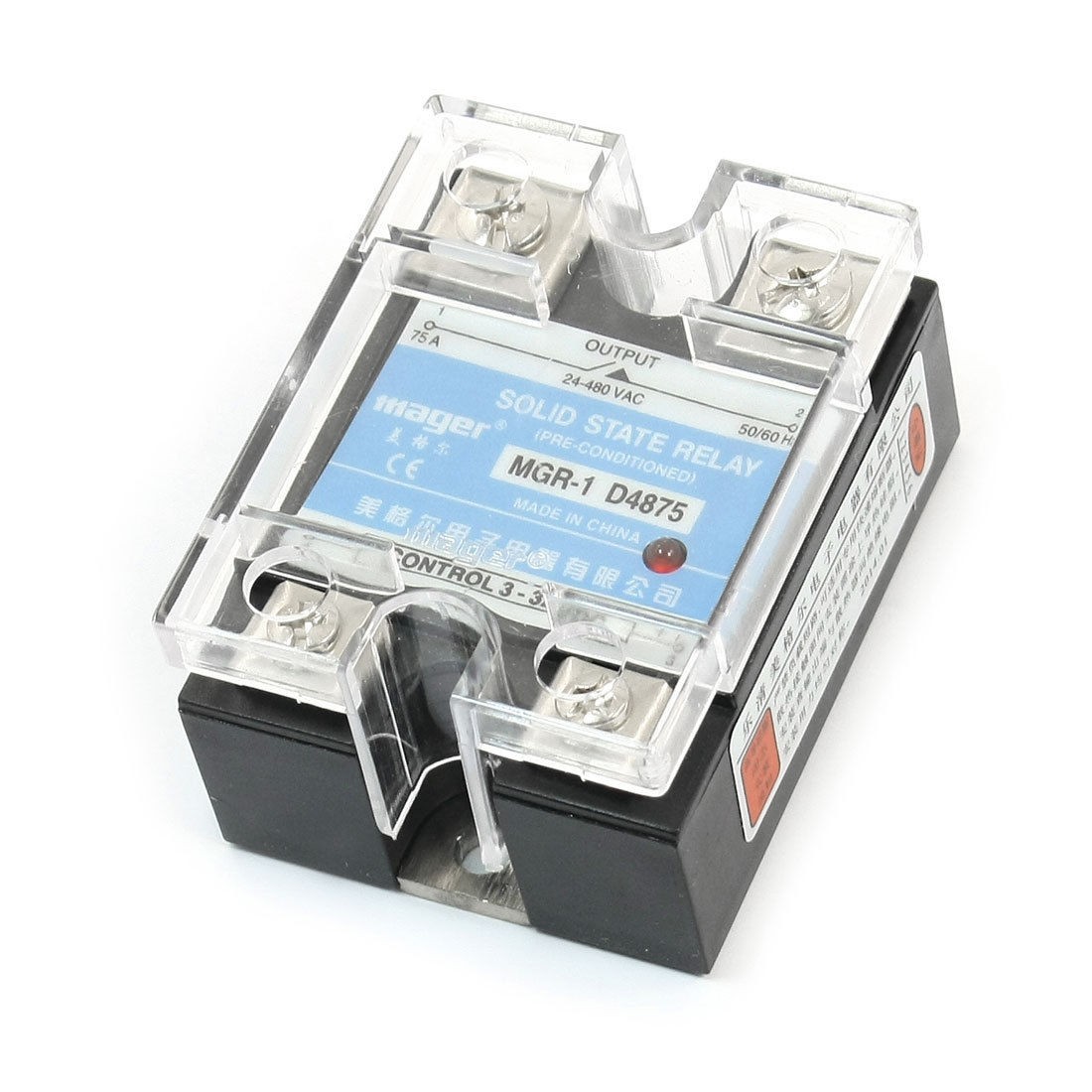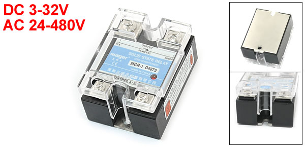 Product Name Solid State Relay Type MGR-1 D4875 Input DC 3-32V Output AC 24-480V 75A 50/60Hz Contact Type NO(Normal Open) Phase 1 Screw Terminal 4 Fixing Hole Dia 4.5mm/0.14" Fixing Center Distance 50mm/2" Total Size (Approx.) 59 x 49x 32mm/ 2.4" x 2" x 1.3"(L*W*T) Material Plastic, Electric Part Net Weight 88g Total Weight 93g Package Content 1 x Solid State Relay w Clear Cover