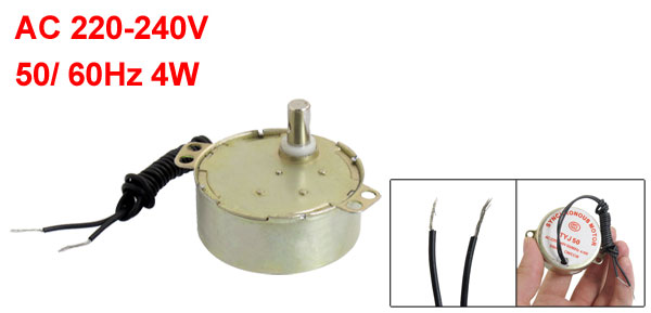 Product Name Synchronous Motor Model TYJ50 Direction CW/CCW Voltage AC 220-240V Frequency 50/ 60Hz Power Max 4W Speed 5/6RPM Overall Size 49 x 21mm/ 1.9" x 0.8"(D*T) Shaft Size 7 x 12mm/ 0.27" x 0.5"(D*L) Mount Hole Diameter 4.5mm/ 0.18" Cable Length 45cm/ 17.7" Main Material Metal Color Gold Tone Net Weight 82g Package Content 1 x Synchronous Motor - Reviews