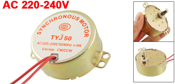 Product Name Synchronous Motor Model TYJ50 Direction CW/CCW Voltage AC 220-240V Frequency 50/ 60Hz Power 4W Speed 5/6RPM Overall Size 65 x 38mm/ 2.6" x 1.5" (D*T) Shaft Size 7 x 12mm/ 0.27" x 0.5" (D*L) Mount Hole Dia. 4.3mm/ 0.17" Cable Length 45cm/ 17.7" Main Material Metal Color As Picture shown Net Weight 82g Package Content 1 x Synchronous Motor  - Reviews