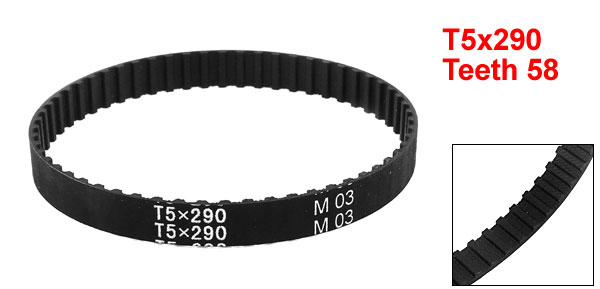 DetailsMilling Machine Timing Belt 58 Teeth 10mm Width 5mm Pitch T5x290  Product Name Timing Belt Model T5x290 Number of Teeth 58 Teeth Pitch 5mm / 0.2" Belt Width 10mm / 0.4" Belt Girth 290mm/ 11.4" Material Rubber Color Black Weight 8g Package Content 1 x Timing Belt