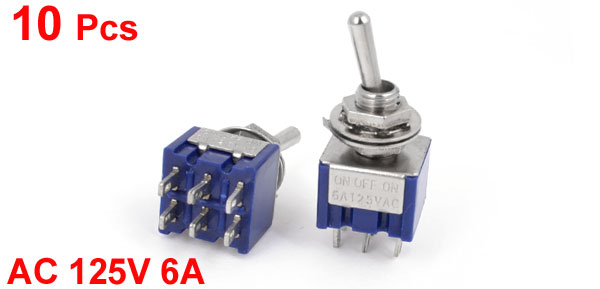 DetailsMini AC 125V 6A 3 Position ON-OFF-ON Blue Toggle Switch 10 Pcs  Product Name Toggle Switch Rating AC 125V 6A Pin Number 6 Pins Position 3 Position(On/Off/On) Type DPDT (Latching) Screw Diameter 6mm Total Size(Approx.) 3.5 x 1.3 x 1.3cm / 1.4" x 0.5" x 0.5"(L*W*T) Weight 61g Package Content 10 Pcs x Toggle Switch