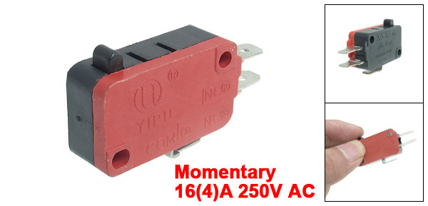 Product Name Micro Switch Contact Type Momentary Rated Load 16(4)A 250V AC Switch Body Size(Each) 3.7 x 1.5 x 0.9m/ 1.5" x 0.6" x 0.4" (L*W*H) Fixing Hole Dia 0.36cm / 0.14" Material Plastic, Metal Color Black, Red Net Weight 8g Package Content 1 x Micro Switch - Reviews