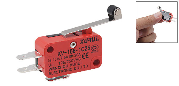 Product Name Micro Switch Model No. XV-156-1C25 Actuator Type Long Roller Lever Arm Rating Ue: AC125/250V, Ie: 15A/7.5A, Ith: 20A Contact configuration SPDT Switch Body Size ~2.8 x 1 x 1.6cm / 1.1" x 0.39" x 0.63"(L*W*H) Fixing Holes Dia. ~0.32cm / 0.13" Button Height ~0.3cm / 0.12" Actuator Size ~2.8 x 0.45cm / 1.1" x 0.18"(L*W) Terminal Blade Width ~0.47cm / 0.19" Material Plastic & Metal Color Red & Silver Tone Net Weight 8g Package Content 1 x Micro Switch - Reviews
