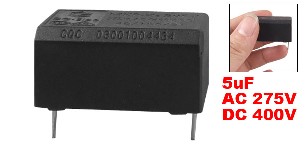 Product Name Induction Cooker Capacitor Housing Material Plastic Dielectric Material Polypropylene Film Model Number MKP-X2 Capacitance 5uF Tolerance ±5% (J) Rated Voltage AC 275V, DC 400V Climate Class 40/105/21 Lead Diameter 0.9mm/0.035" Body Dimension 2.5 x 3.5 x 1.7cm/0.98" x 1.37" x 0.7"(H * W * T) Color Black Weight 18g Package Content 1 x Induction Cooker Capacitor - Reviews