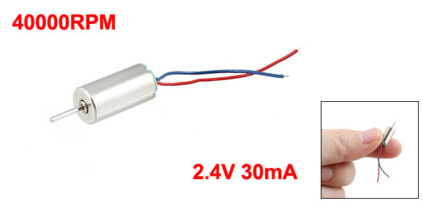 DetailsModel Aircraft 40000RPM Output Speed DC Coreless Motor 2.4V 30mA  Product Name DC Coreless Motor Working Voltage DC 1.7-4V Rated Voltage DC 2.4V Start Voltage DC 1.3V Rated Current 30mA Stall Current 240mA Rated Speed 40000±1000RPM Resistance 8 Ohm Body Size 17 x 6mm / 0.56" x 0.24"(L*D) Wire Cable Length 30mm/ 1.2" Total Length 47mm/ 1.85" Main Color Silver Tone, Red, Blue Main Material Metal, Plastic Weight 3g Package 1 x DC Coreless Motor