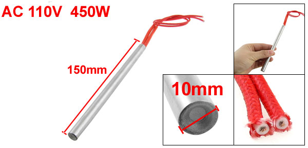 DetailsMold Heating Element 10x150mm Single End Cartridge Heater AC 110V 450W  Product Name Cartridge Heater Material Stainless Steel, PVC, Nylon Rated Voltage AC 110V Power 450W Heater Size (Approx.) 10 x 150mm / 0.39" x 5.9" (D * L ) Wire Length (Approx.) 26.5cm / 10.4" Color Silver Tone, Red Weight 58g Package Content 1 x Cartridge Heater