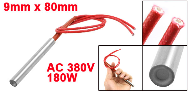 Product Name Cartridge Heater Material Stainless Steel, PVC, Nylon Rated Voltage AC 380V Power 180W Heater Size (Approx.) 9 x 80mm / 0.35" x 3.1" (D * L ) Wire Length (Approx.) 33cm / 13" Color Silver Tone, Red Weight 31g Package Content 1 x Cartridge Heater - Reviews