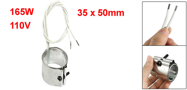 Product Name Band Heater Main Material Stainless Steel, Mica Power 165W Voltage 110V Cable Length 360mm/14.2" Size 35 x 50mm/ 1.4" x 2" (Inside Dia.*H) Overall Size 46 x 38 x 50mm/ 1.8" x 1.5" x 2" (L*W*H) Color Silver Tone Net Weight 92g Package Content 1 x Band Heater - Reviews