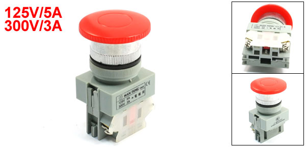 Product Name Emergency Stop Push Switch Material Plastic, Metal Rated Voltage, Current 125V/5A, 300V/3A Button Diameter (Approx.) 4cm/ 1.6" Mount Screw Dia 2.2cm/ 0.87" Total Size (Approx.) 7.3 x 4cm/ 2.8" x 1.6"(L*D)